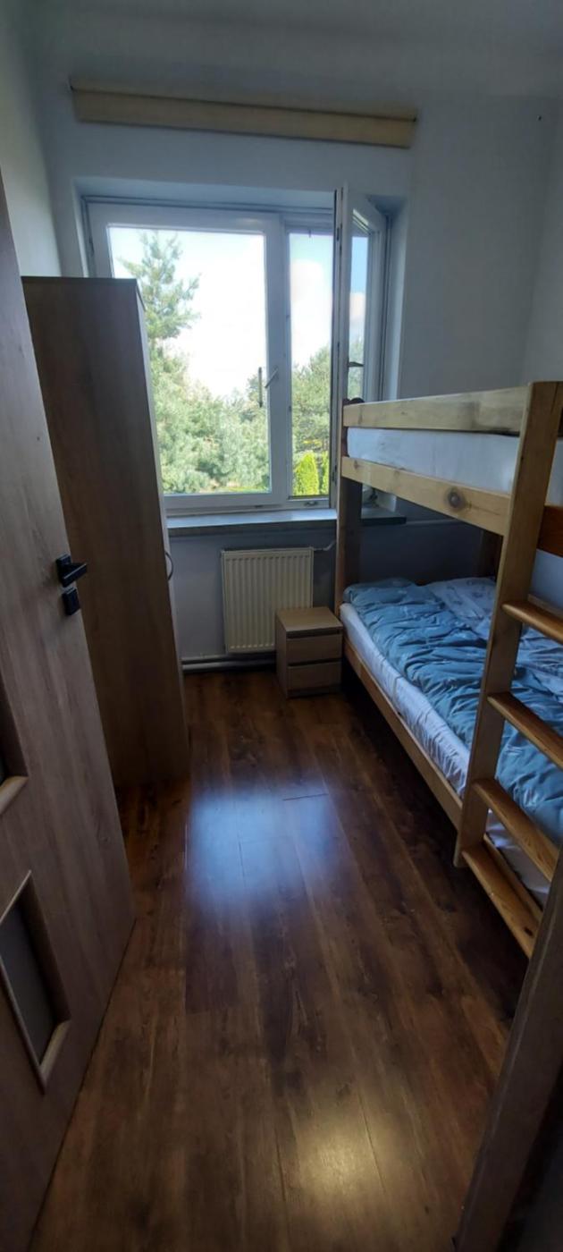 Pokój Czteroosobowy. The quadruple room provides parquet floors and heating, as well as a shared bathroom featuring a shower. The fully equipped kitchen features a stovetop, a refrigerator, kitchenware and an oven. Among the room amenities are a tea and coffee maker, a dining area, a wardrobe as well as an outdoor dining area and garden views. The unit offers 4 beds. Pokój Czteroosobowy - 4 osobowy. Powierzchnia pokoju ok.: 25 mkw. ;