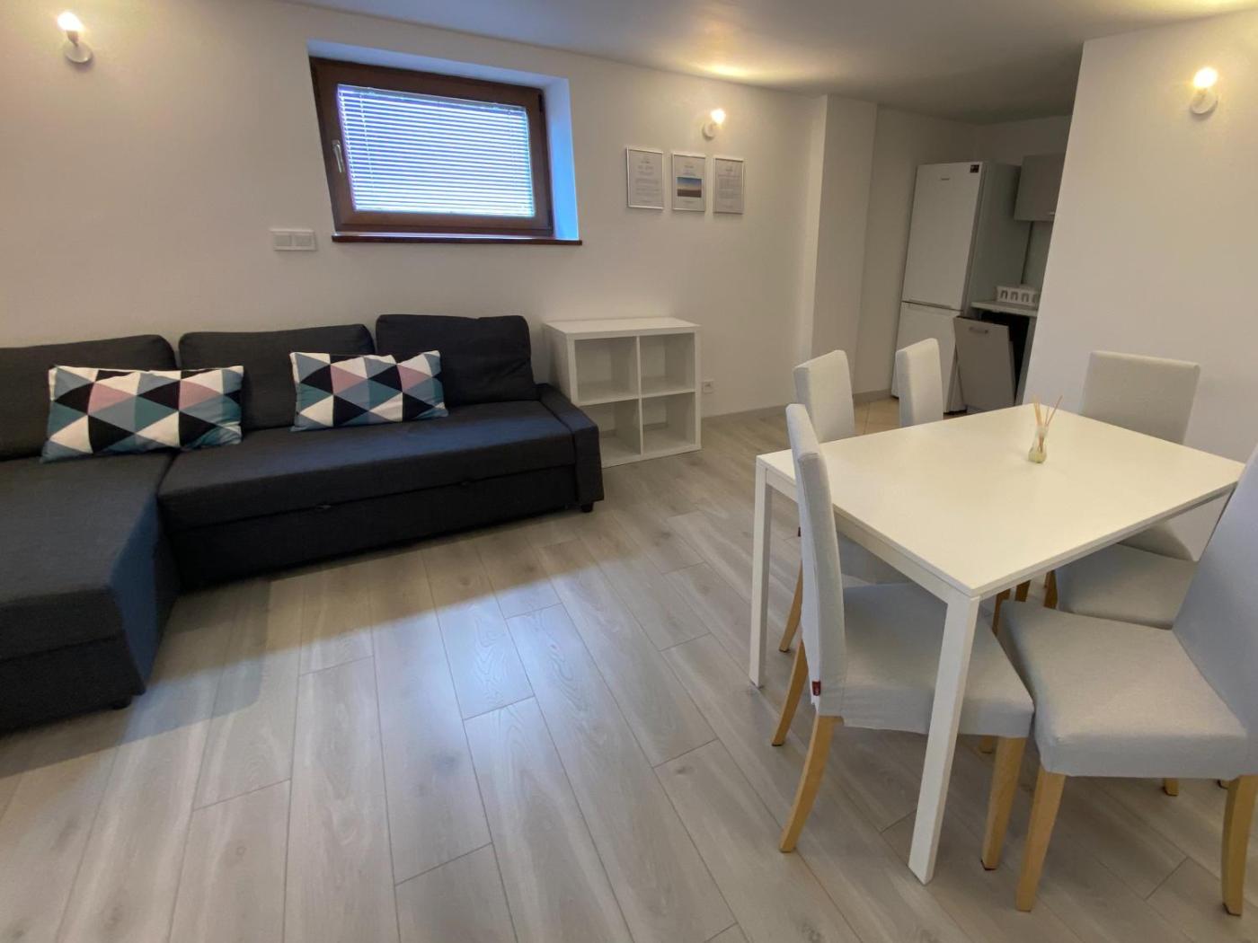 Apartament – parter. Featuring a private entrance, this apartment also consists of 1 living room, 2 separate bedrooms and 1 bathroom with a walk-in shower. In the kitchen, guests will find a stovetop, a refrigerator, a dishwasher and kitchenware. This apartment features soundproof walls, a tea and coffee maker, a flat-screen TV and an outdoor dining area. The unit offers 3 beds. Apartament - 6 osobowy. Powierzchnia pokoju ok.: 50 mkw.